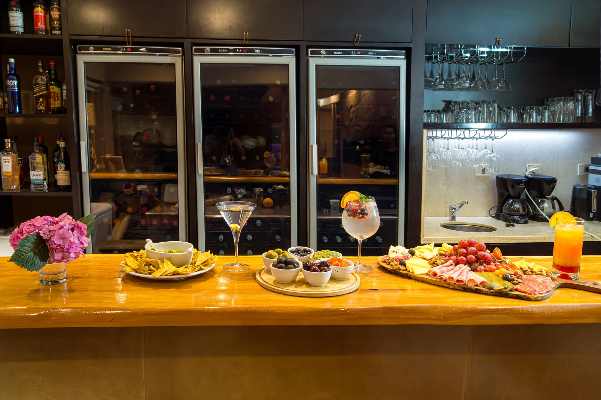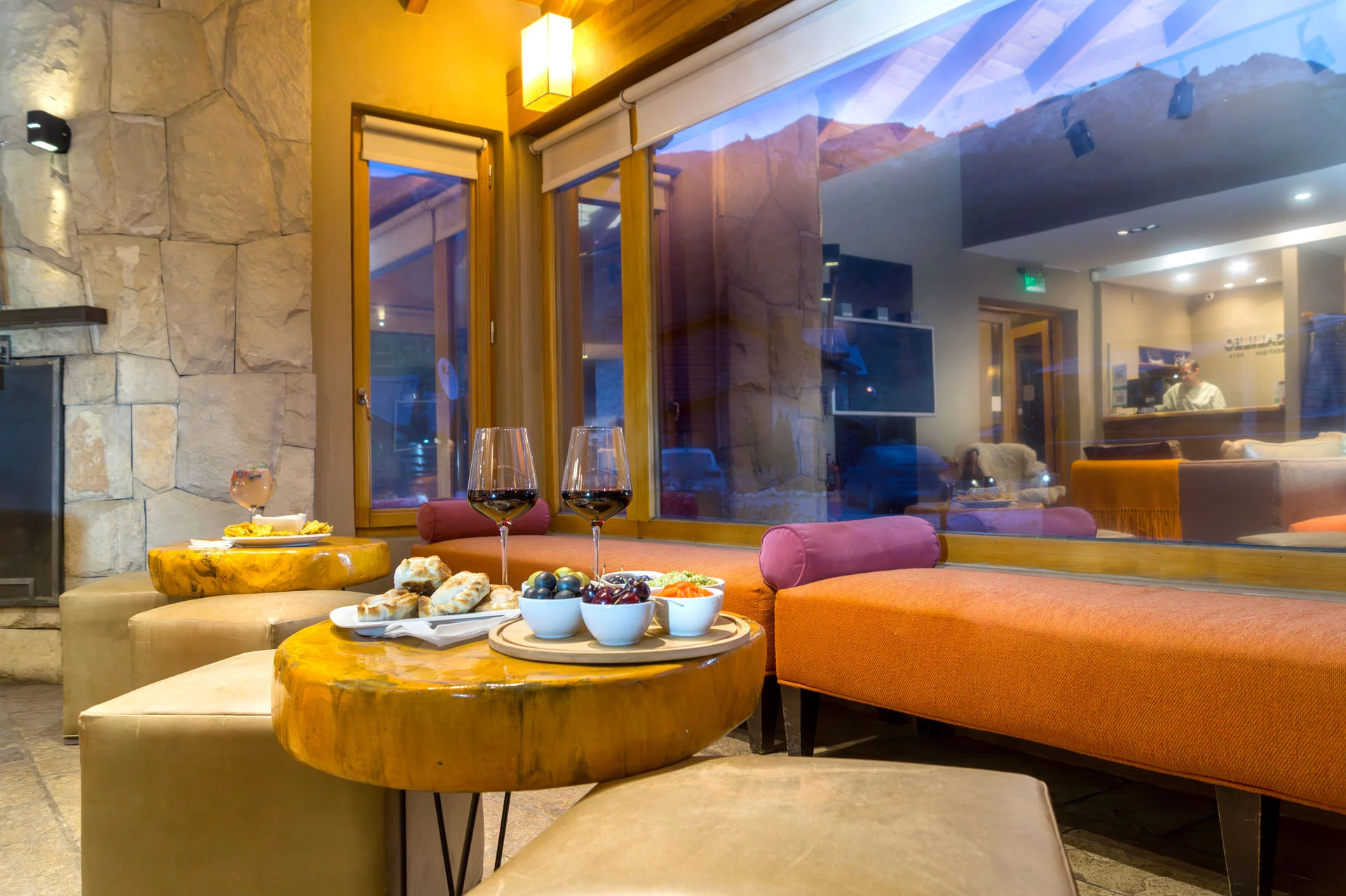 Por la noche, el Wine Bar se convierte en un espacio íntimo para disfrutar de una copa de vino de nuestra selecta carta de bodegas Patagónicas, una cerveza artesanal o un cocktail en un entorno tranquilo.